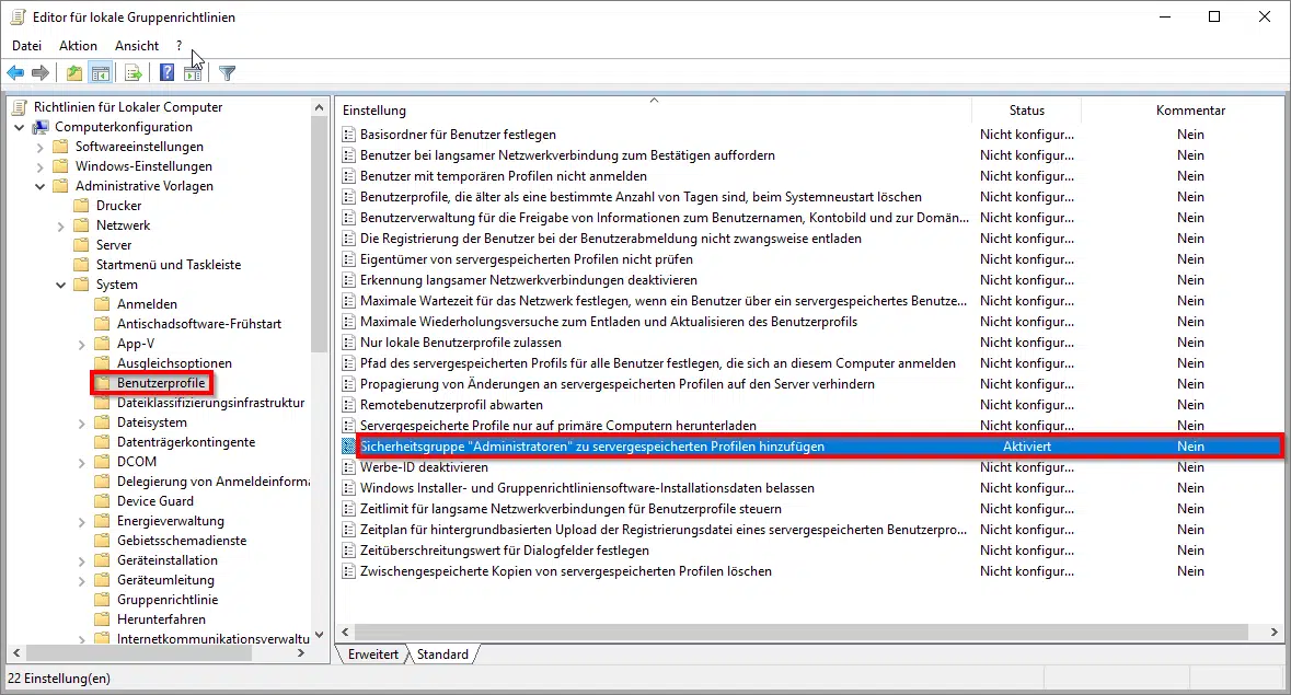 die Einstellung „Sicherheitsgruppe „Administratoren“ zu servergespeicherten Profilen hinzufügen“. Wenn Ihr diese Richtlinie aktiviert so werden die Administratoren bei der Neuanlage von „.V2“ Benutzerprofilen und Windows Vista, Windows 7, Windows 8.1 und Windows 10 in die Sicherheitseinstellungen der Profilverzeichnisse eingetragen und Ihr habt somit Zugriff auf die Ordner und Dateien.