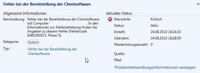 In der Verwaltungsoberfläche wurde sichtbar, dass die Clientinstallation immer wieder mit dem Fehler 0x8024D015 fehl schläft. Die genaue Fehlermeldung lautet wie folgt: