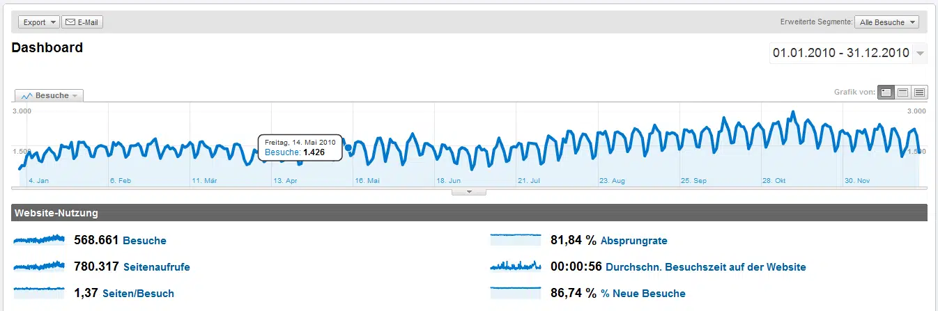 Im vergangenen Jahr 2010 hatten wir 568.661 (Vorjahr 205.126) Besucher mit 780.317 (Vorjahr 281.737) Page Impressions gehabt. Somit haben sich die Zahlen gegenüber dem Jahr 2009 extrem verbessert.