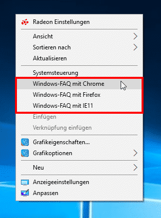 Außerdem arbeite ich sehr gerne nicht nur mit dem Internet Explorer (IE11), sondern auch mit dem Google Chrome und dem Firefox. Und es gibt eine sehr schöne Funktion, um das Kontextmenü des Desktops bzw. des Windows Explorers um feste Einträge zu erweitern, wie Ihr im nachfolgenden Bild erkennen könnt.