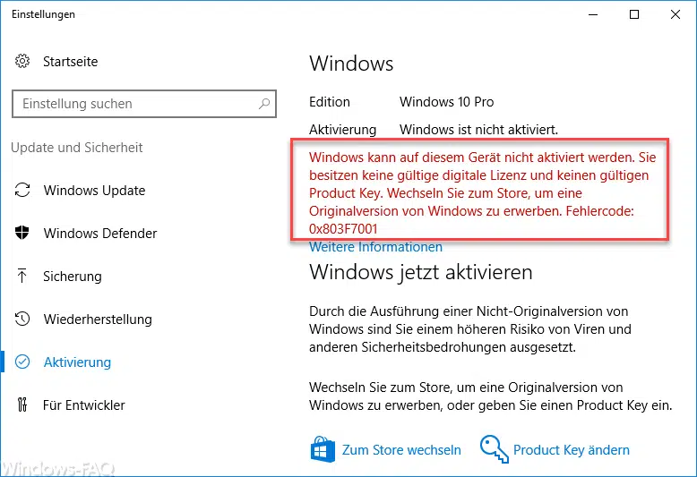 Windows kann auf diesem Gerät nicht aktiviert werden. Sie besitzen keine gültige digitale Lizenz und keinen gültigen Product Key. Wechseln Sie zum Store, um eine Originalversion von Windows zu erwerben. Fehlercode: 0x803F7001