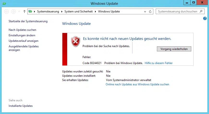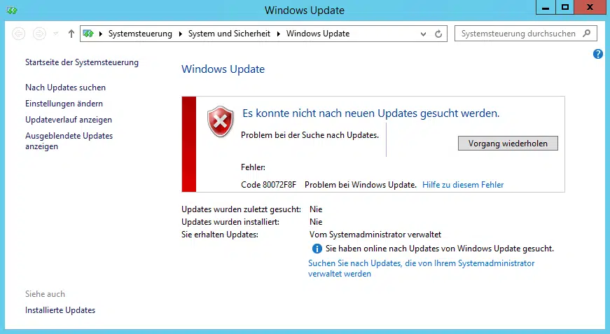 Heute standen wir vor dem Problem, dass ein komplett neu aufgesetzter Dell PowerEdge Server mit Windows Server 2012 R2 Deutsch Standard Probleme mit der Suche und Installation von Windows Updates hatte. Nach dem Aufruf der „WUAPP“ erschienen generell folgende Fehlermeldungen.