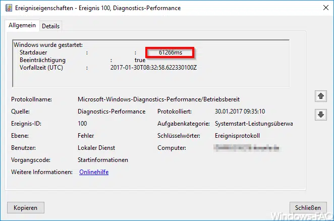 In diesem Beispiel findet Ihr 4 Einträge vom Typ „Ereignisid 100„. Zwei Einträge davon sind als Warnung gekennzeichnet, 2 weitere hingegen als Fehler. Dies liegt daran, dass Windows der Meinung ist, dass es zweimal zu lange gedauert hat, Windows zu starten. Dies wird in dem Beispiel, welches wir Euch hier nachfolgend zeigen, über 61000 Millisekunden gedauert und dies ist einfach zu lange.