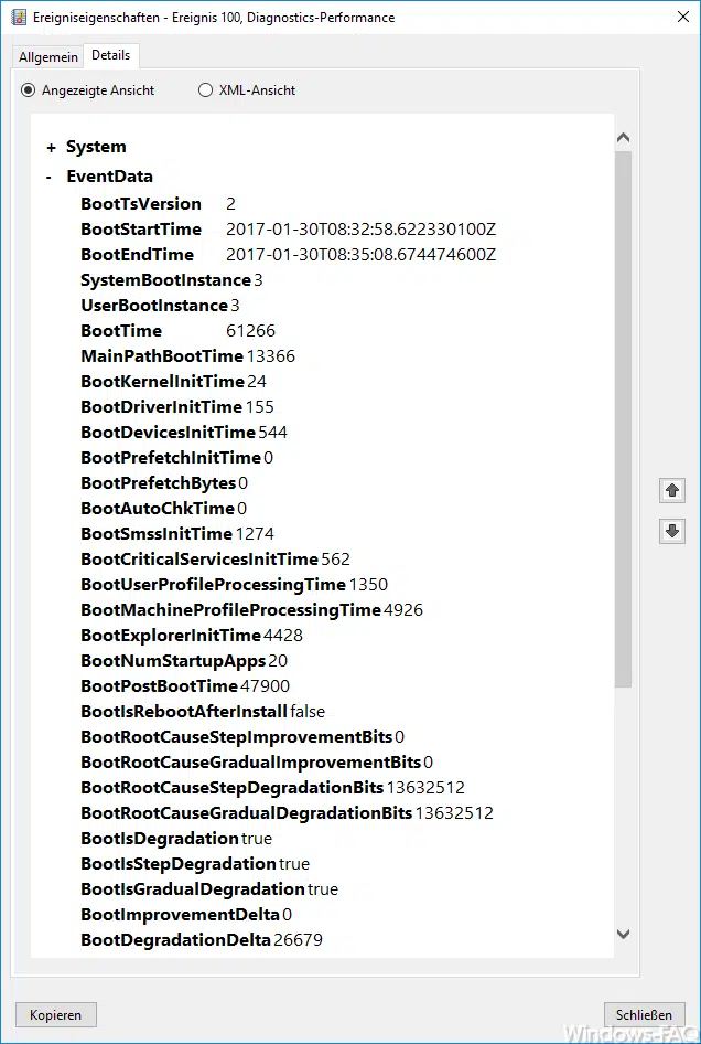 Interessant wird es, wenn Ihr Euch die Details des Windows Ereignis 100 anschaut, denn dort sind viele Informationen zu den einzelnen Bootvorgängen sichtbar, wie Ihr hier nachfolgend sehen könnt.