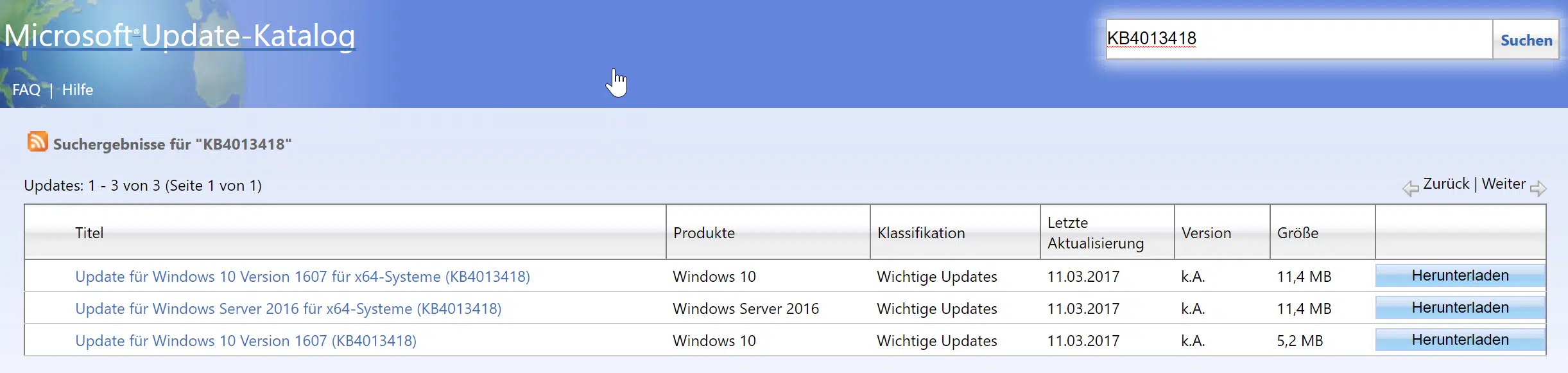 Hier nachfolgend findet Ihr die Downloadlinks zu dem kritischen Windows 10 Update KB4013419.