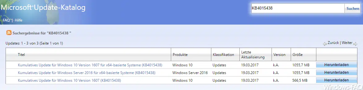 Hier nachfolgend haben wir Euch noch die passenden Downloadlinks für die verschiedenen Versionen des Updates KB4015438 aufgelistet.