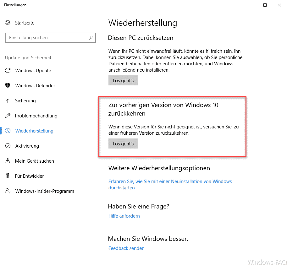 Dort wird Euch die Möglichkeit angeboten, zur vorherigen Windows 10 Version zurückzugehen. Folgende Option wird angezeigt.