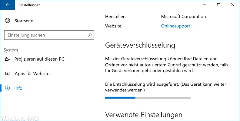 Der Entschlüsselungsvorgang kann einige Zeit dauern, in dieser Zeit könnt Ihr aber problemlos am PC weiterarbeiten. Am Ende erscheint dann die Meldung, dass die Geräteverschlüsselung nun deaktiviert ist. Somit ist auch das gelbe Ausrufezeichen im Windows Explorer nun verschwunden. Selbstverständlich könnt Ihr die Bitlocker Verschlüsselung jederzeit wieder aktivieren.