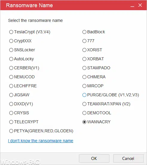 Nach dem Start des Anti-Ransomware Tools müsst Ihr zunächst den Typ bzw. den Namen des Ransomware-Virus auswählen. Aktuell ist diese Entschlüsselungs-Tool in der Lage, 23 der bekanntesten Ransomware-Viren zu entschlüsseln. Hier nachfolgend seht Ihr die entsprechende Ransomware-Auswahlliste, die dieses Tool anbieten.