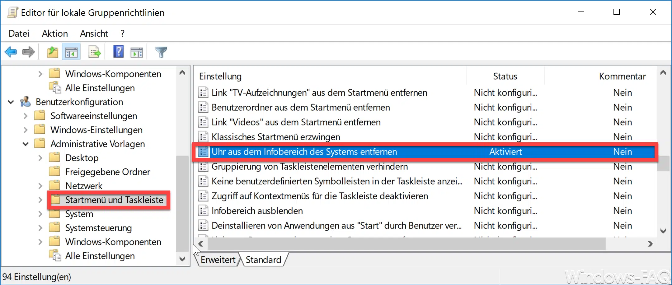 Wenn Sie diese Einstellung deaktivieren oder nicht konfigurieren, wird die Uhr standardmäßig im Infobereich angezeigt.