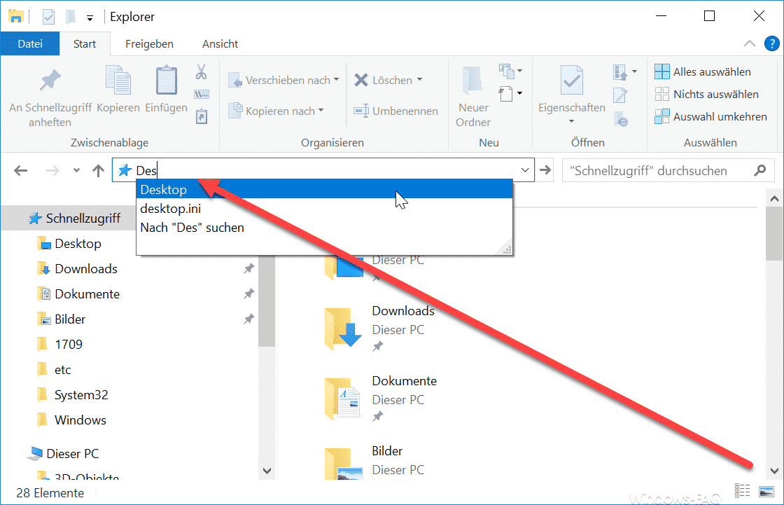 Windows 10 bietet die Option, dass Eure Eingaben in der Adressleiste im Windows Explorer durch eine Auto Vervollständigen Funktion unterstützt werden. Das äußert sich so, dass begonnene Begriffe vom Windows 10 automatisch vervollständigt bzw. vorgeschlagen werden. Im nachfolgendem Beispiel seht Ihr, wie Windows 10 aus „Des“ den passenden Begriff „Desktop“ vorschlägt.