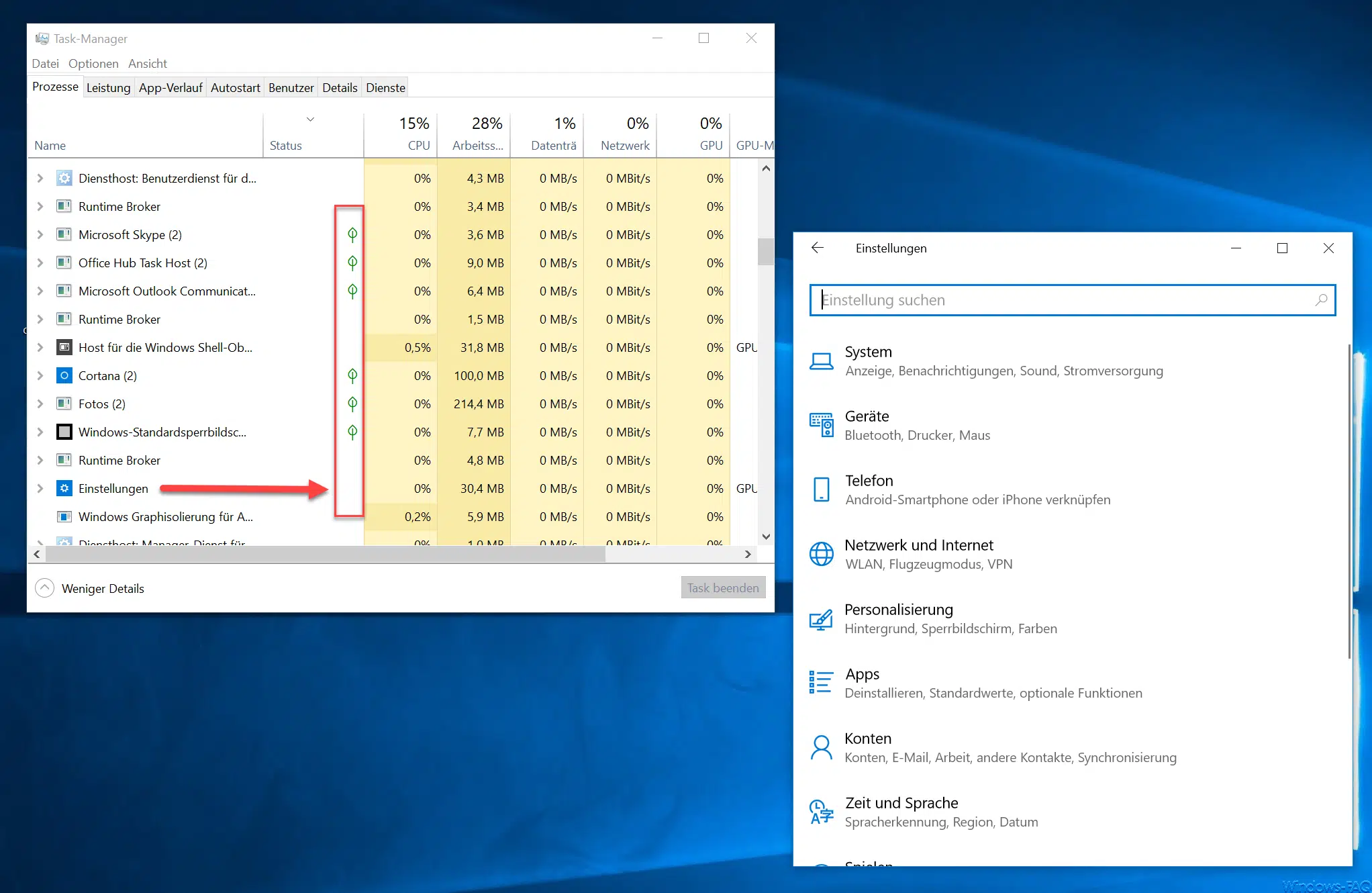 Aber welche Bedeutung dieses neue Symbol hat, ist zunächst völlig unklar. Erst durch einige Recherche wurde klar, dass es mit den Windows 10 Apps zu tun hat. Bei allen Apps, die nicht aktiv im Vordergrund sind bzw. laufen, taucht dieses neuartige Taskmanagersymbol auf. Dies könnt Ihr auch an der folgenden Abbildung erkennen. Diese zeigt, wie die App „Windows-Einstellungen“ neben dem Task-Manager geöffnet ist und dadurch auch das neue Symbol im Task-Manager verschwunden ist, obwohl es im ersten Bild ebenfalls bei diesem Prozess vorhanden war.