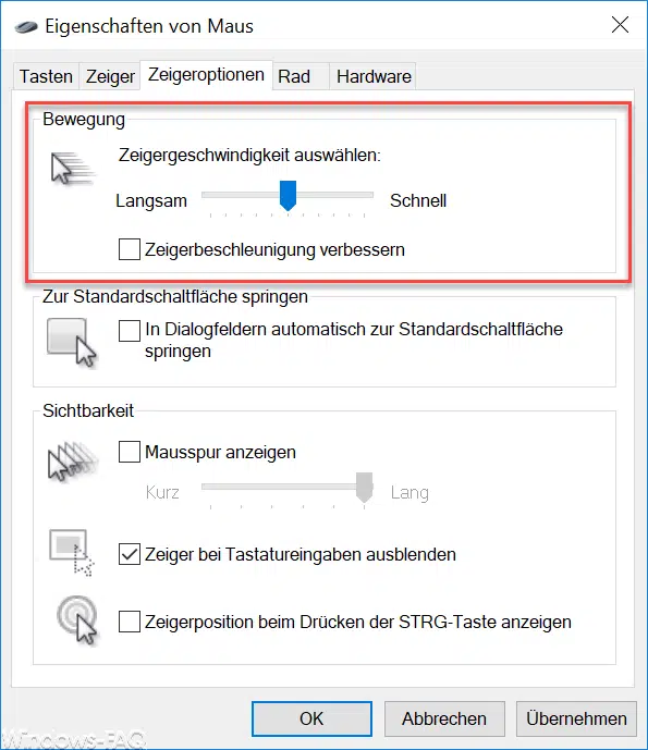 Hier könnt Ihr nun die Maus Zeigergeschwindigkeit so einstellen, wie sie für Euch am besten ist. Am einfachsten, Ihr probiert die optimale Mausgeschwindigkeit aus, indem Ihr den Schieberegler entsprechend einstellt. Die Einstellungen werden sofort nach Bestätigen von „Übernehmen“ aktiv.