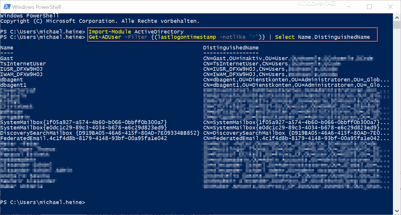Zunächst werden über den Befehl „Import-Module ActiveDirectory“ die notwendigen Funktionenserweiterungen der PowerShell für Abfragen des Active Directory geladen, sodass dann mit dem „Get-ADUser“ Befehl die inaktiven bzw. ungenutzten Active-Directory Konten aufgelistet werden. Bei der Liste wird der AD Kontoname und der „DistinguishedName“ angezeigt, wie Ihr auf dem Bild erkennen könnt.