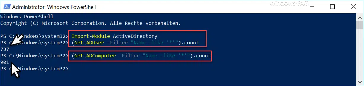 Wie Ihr seht, wird jeweils unterhalb des Befehls die reine Anzahl der AD Objekte angezeigt. In unserem Beispiel sind es über die gesamte Domain 737 Active Directory Userobjekte und 901 AD Computerobjekte.