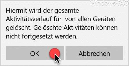 Um generell alle Informationen oder Aktivitäten der Windows Timeline zu löschen, kann dies über die Option „Aktivitätsverlauf löschen“ durchführen. Vor der Löschung erscheint allerdings noch die Sicherheitsabfrage