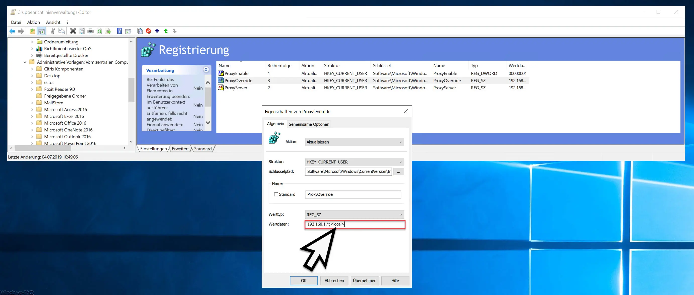 Wichtig dabei ist, dass die Werte innerhalb des Registrywertes „ProxyOverride“ alle mit einem Semikolon „;“ getrennt werden. Auch die Klammern müssen so wie abgebildet mit angegeben werden.