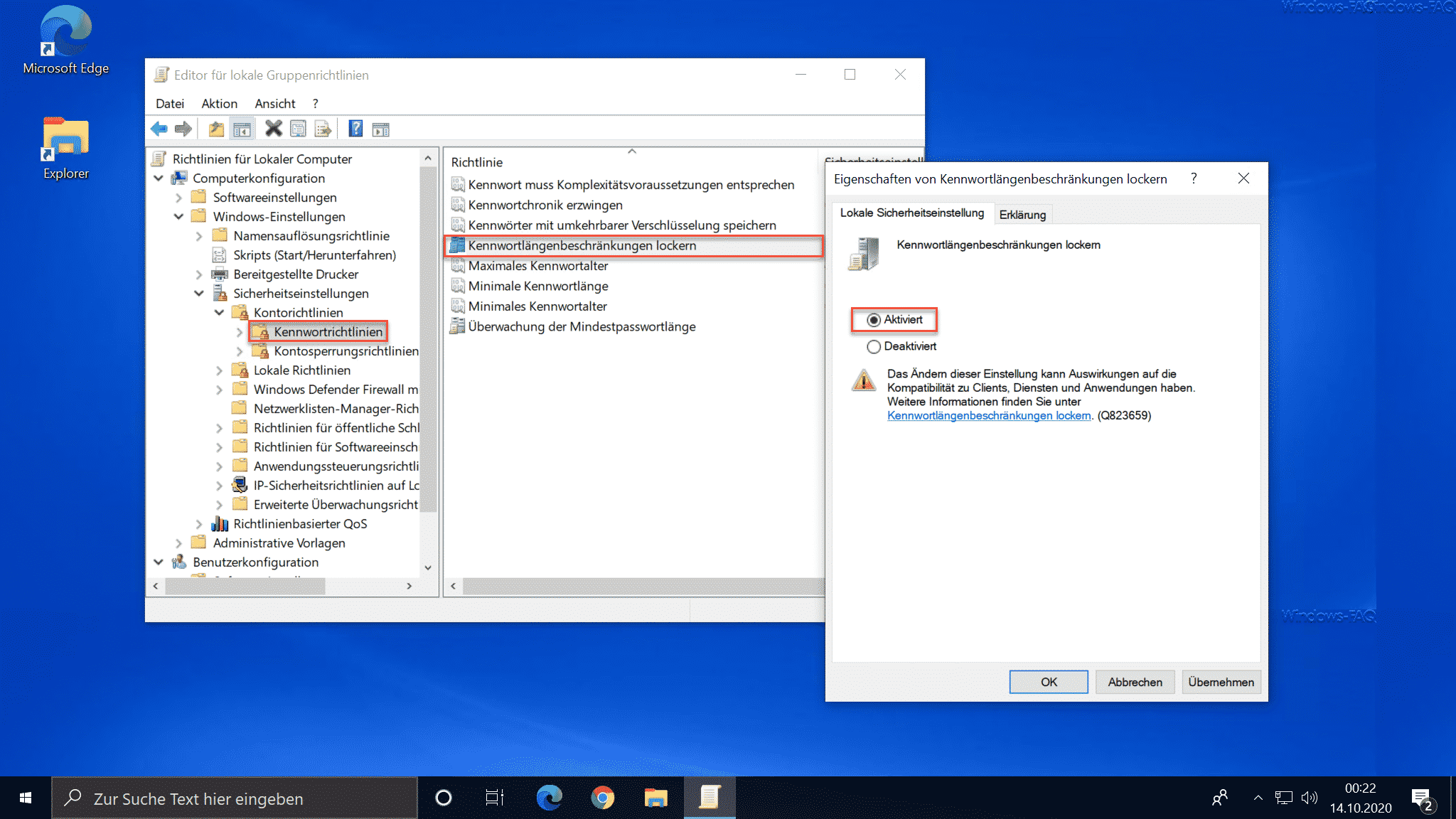 Microsoft weißt darauf hin, dass nicht alle Programme mit dieser neuen GPO zurecht kommen und dass es ggf. zu Problemen kommen kann. Dies muss dann im Einzelfall geprüft werden. Um eine Überwachung der Minderstpasswortlänge einzustellen, könnt Ihr dann noch die GPO