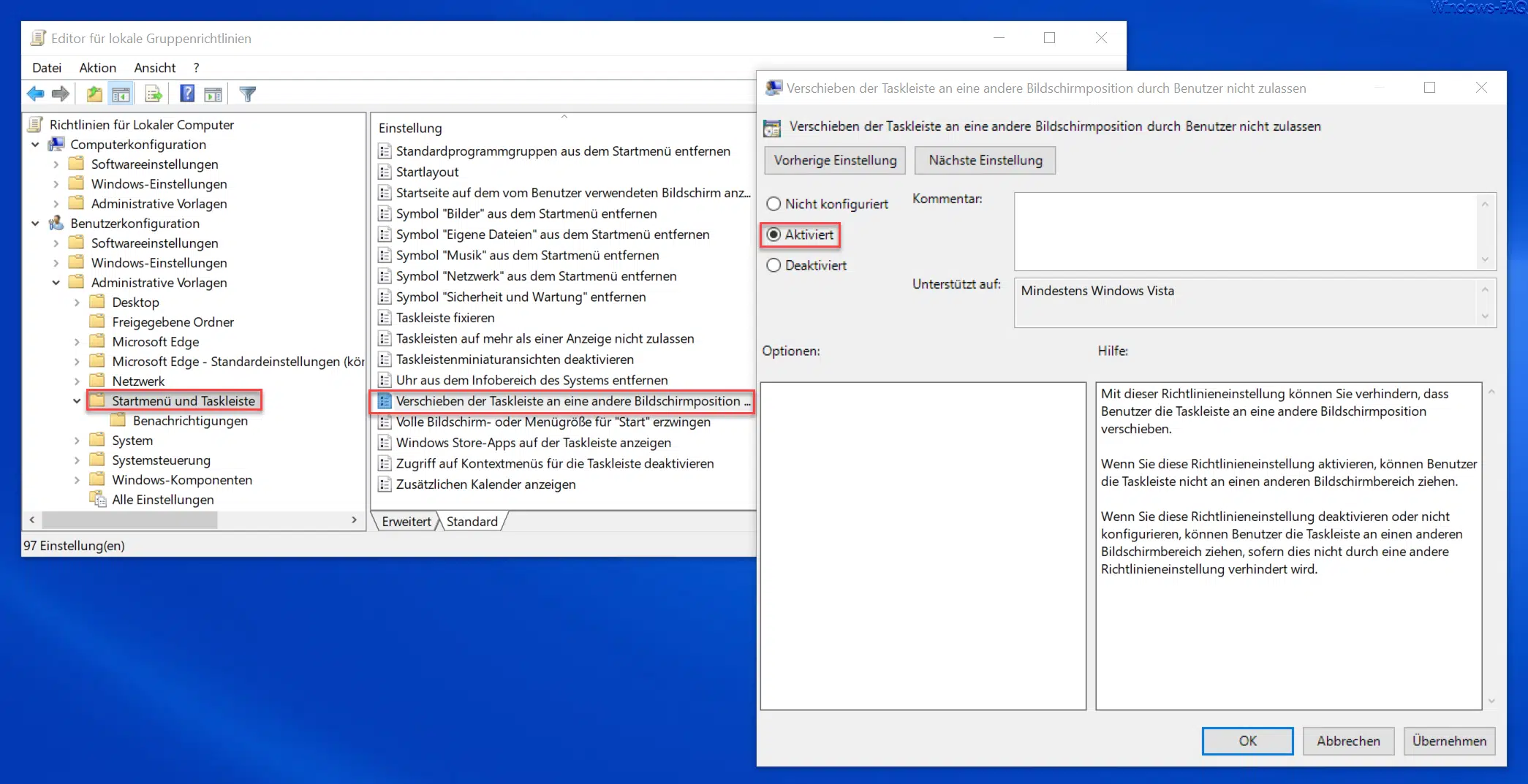 Wenn Sie diese Richtlinieneinstellung aktivieren, können Benutzer die Taskleiste nicht an einen anderen Bildschirmbereich ziehen.