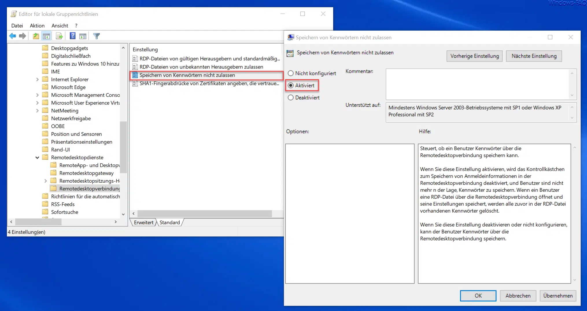 vorhanden und kann aktiviert werden. In diesem Fall speichert Windows die RDP-Anmeldedaten und Ihr könnt somit bei weiteren Remotedesktop-Verbindungen zu diesem System einfacher darauf zugreifen, da Ihr das Windows Kennwort nicht erneut eingegeben müsst.