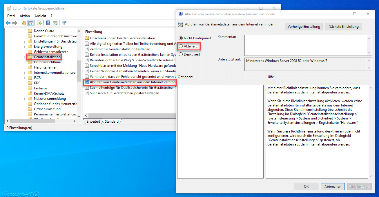 Wenn Sie diese Richtlinieneinstellung deaktivieren oder nicht konfigurieren, wird durch die Einstellung im Dialogfeld „Geräteinstallationseinstellungen“ gesteuert, ob Gerätemetadaten aus dem Internet abgerufen werden.
