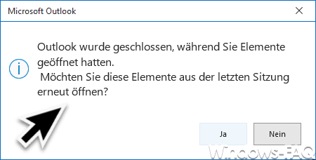 Outlook wurde geschlossen während Sie Elemente geöffnet hatten. Möchten Sie diese Elemente aus der letzten Sitzung erneut öffnen?