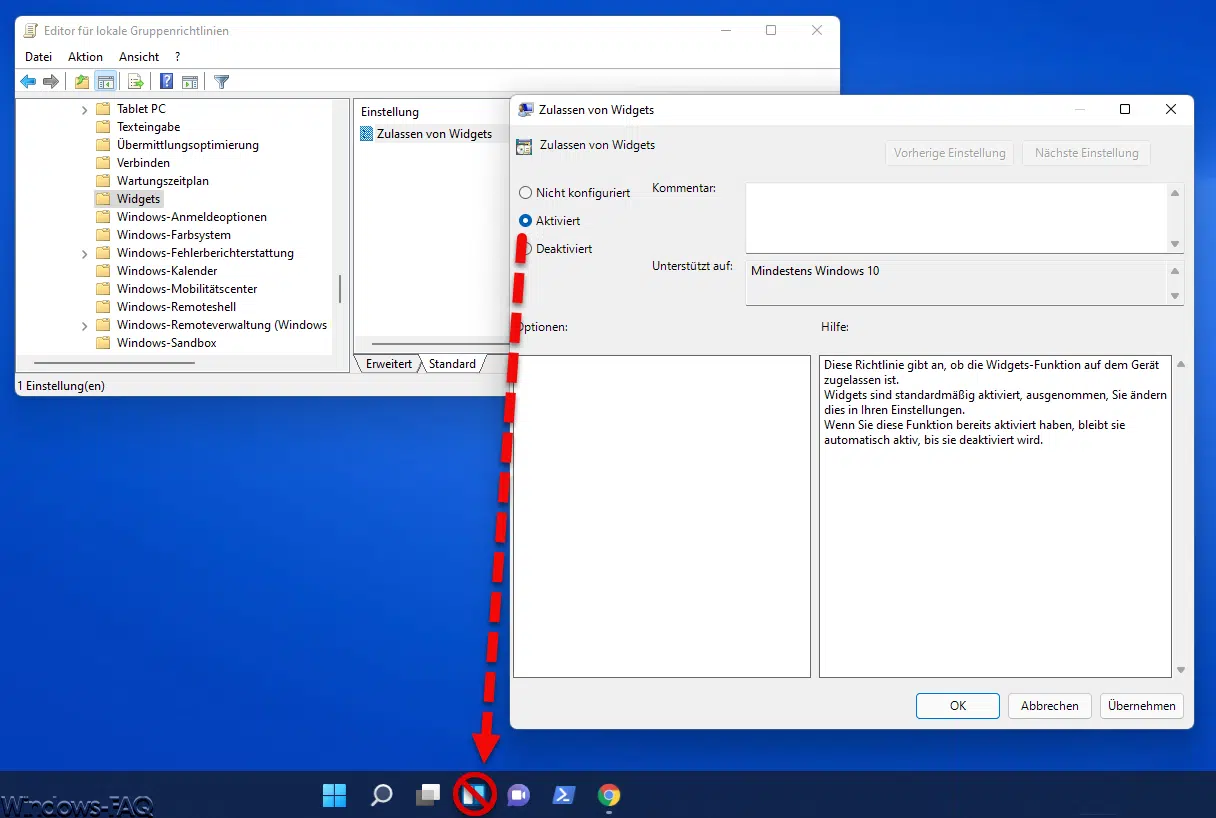 Sobald Ihr diese GPO aktiviert wird das Widgets Symbol ausgeblendet. Microsoft erklärt diese GPO wie folgt.