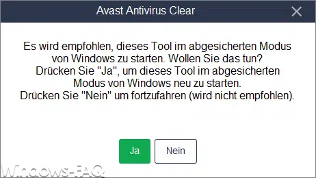 Nach dem Start erscheint ein Hinweis, dass es besser wäre, die vollständige Avast Deinstallation im abgesicherten Modus von Windows durchzuführen. Wenn Ihr dies nicht wünscht, so müsst Ihr die folgende Frage mit „Nein“ beantworten.
