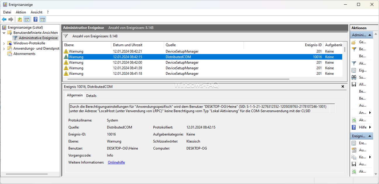 - Suchen nach DCOM-Fehlern: Suchen Sie in der Liste nach Ereignissen mit der Event-ID „10016„. Doppelklicken Sie auf das Ereignis, um Details anzuzeigen.