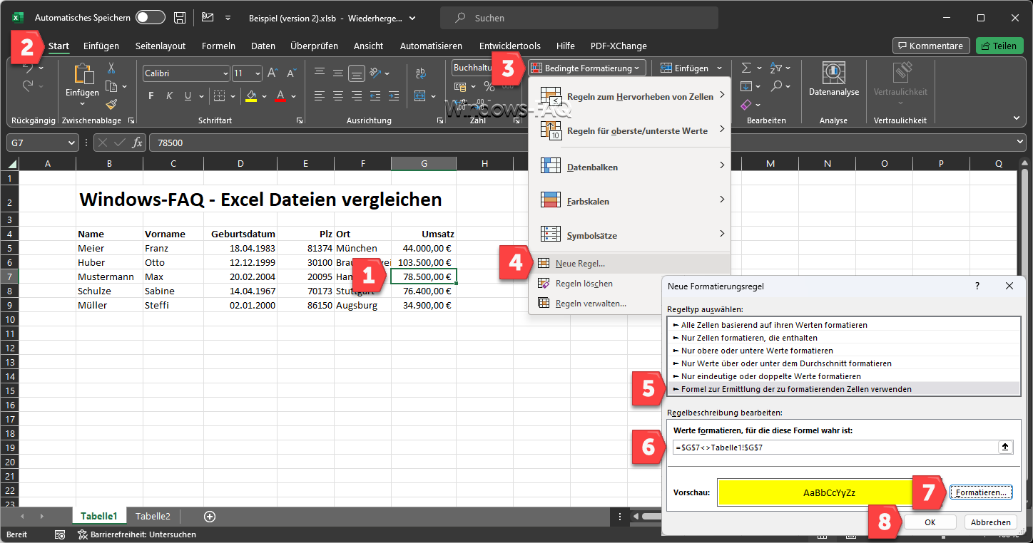 - Über „Formatieren“ können Sie dann z.B. die Farbe bestimmen, mit denen die Zellen mit Unterschieden markiert werden sollen. In unserem Beispiel haben wir „Gelb“ als farblicher Hervorhebung gewählt. (7)