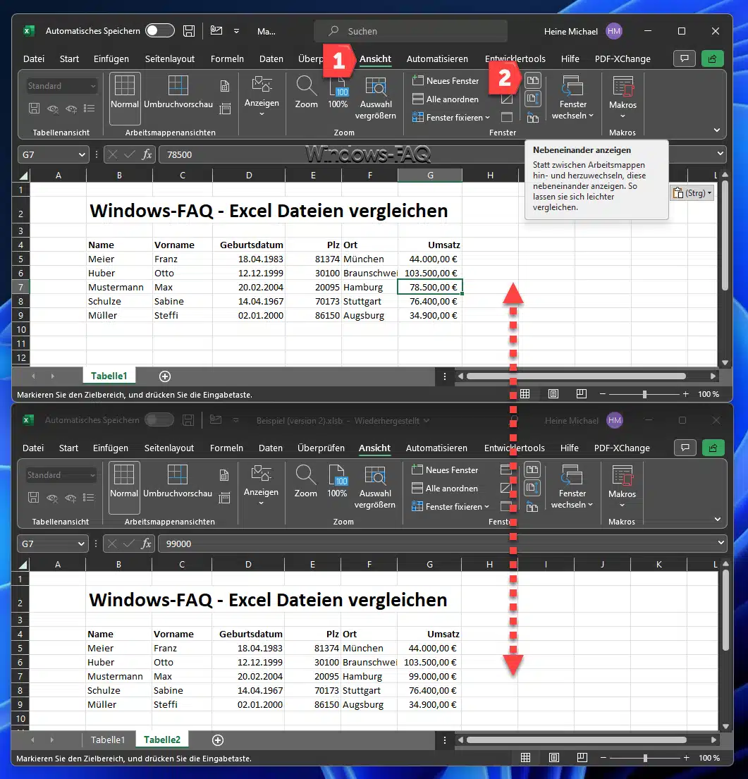 Wie zu erkennen ist, stellt Excel dann beide Fenster automatisch untereinander dar. Somit können Sie per Sichtkontrolle überprüfen, ob und in welchen Zellen es Abweichungen gibt. Diese Methode ist sicherlich sehr aufwendig, vor allem bei großen Dateien unpraktisch. Hier kommt dann die dritte Möglichkeit zum Tragen, um Excel Dateien miteinander zu vergleichen.