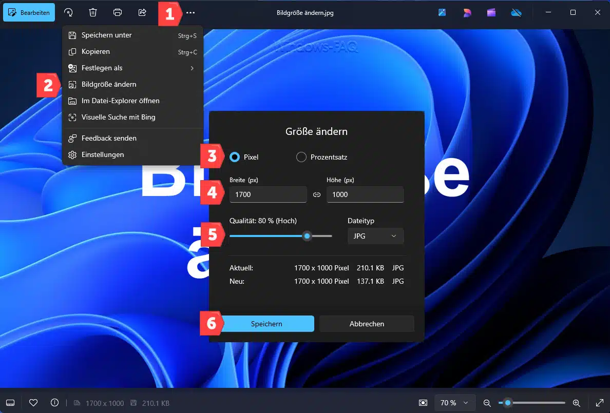 - Klicke in der rechten oberen Ecke des Fensters auf die drei Punkte (…) und wähle „Bildgröße ändern“ aus dem Dropdown-Menü.