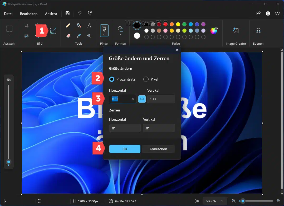 - Prozent: Du kannst die Größe des Bildes prozentual verringern oder vergrößern. Wenn du die Werte z.B. auf 50 % setzt, wird das Bild halb so groß wie das Original.