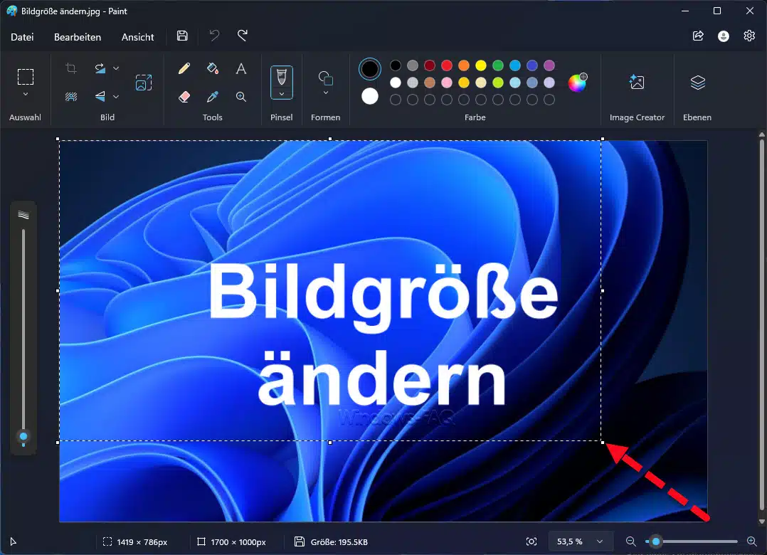 Wie auf der nachfolgenden Abbildung zu erkennen ist, reicht es ebenfalls möglich, die Bildgröße über die Ränder zu verändern. Einfach die Ecken bzw. die weißen Markierungspunkte mit der gedrückten linken Maustaste an die gewünschte Stelle ziehen. Das könnt Ihr sowohl mit den 4 äußeren Ecken, als auch mit den seitlichen, oberen und unteren Markierungspunkten durchführen. Somit könnt Ihr die Bildgröße ändern und an Eure Bedürfnisse anpassen.