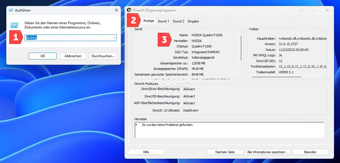 - Im DirectX-Diagnose-Tool finden Sie unter dem Reiter „Anzeige“ Informationen zu Ihrer Grafikkarte.
