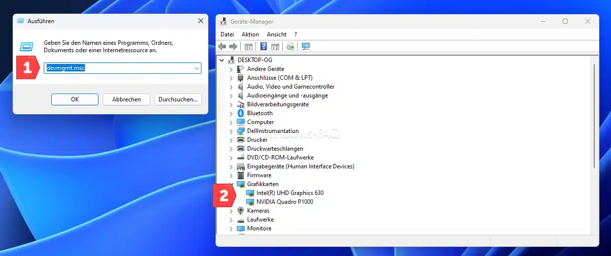 - Oder rufen Sie, wie auf der Abbildung zu sehen ist, den Windows Ausführen Dialog mit der Tastenkombination Windows Taste + „R“ auf und starten den Windows Gerätemanager über den Befehl „devmgmt.msc„.