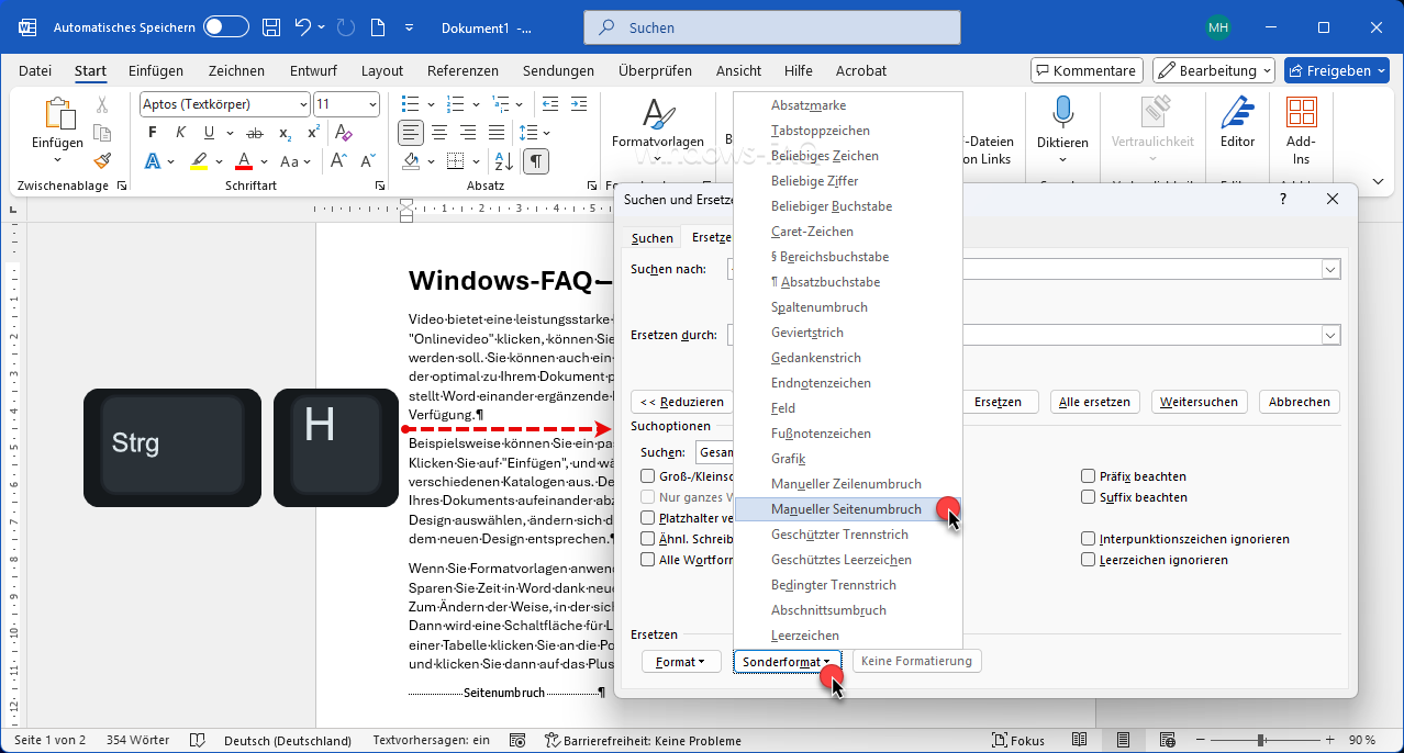 Die Word Suchen- und Ersetzen-Funktion eignet sich hervorragend, um mehrere Seitenumbrüche gleichzeitig zu entfernen. Diese Methode ist besonders nützlich, wenn Sie mit umfangreichen Dokumenten arbeiten, in denen sich zahlreiche manuelle Seitenumbrüche befinden. Statt jeden Umbruch einzeln zu suchen und zu löschen, können Sie mit wenigen Klicks alle Umbrüche auf einmal entfernen:
