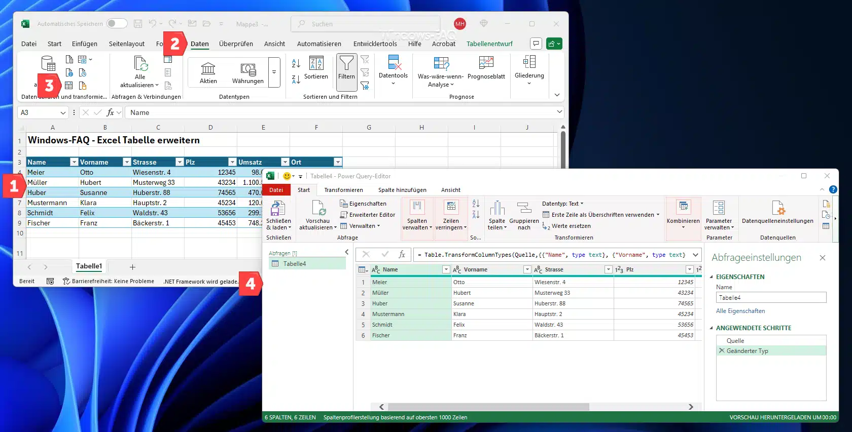 Mit Power Query (in Excel auch als „Daten abrufen und transformieren“ bekannt) können Sie Tabelleninhalte aus verschiedenen Quellen zusammenführen. Um Ihrer Tabelle zusätzliche Zeilen hinzuzufügen, können Sie diese Schritte durchführen: