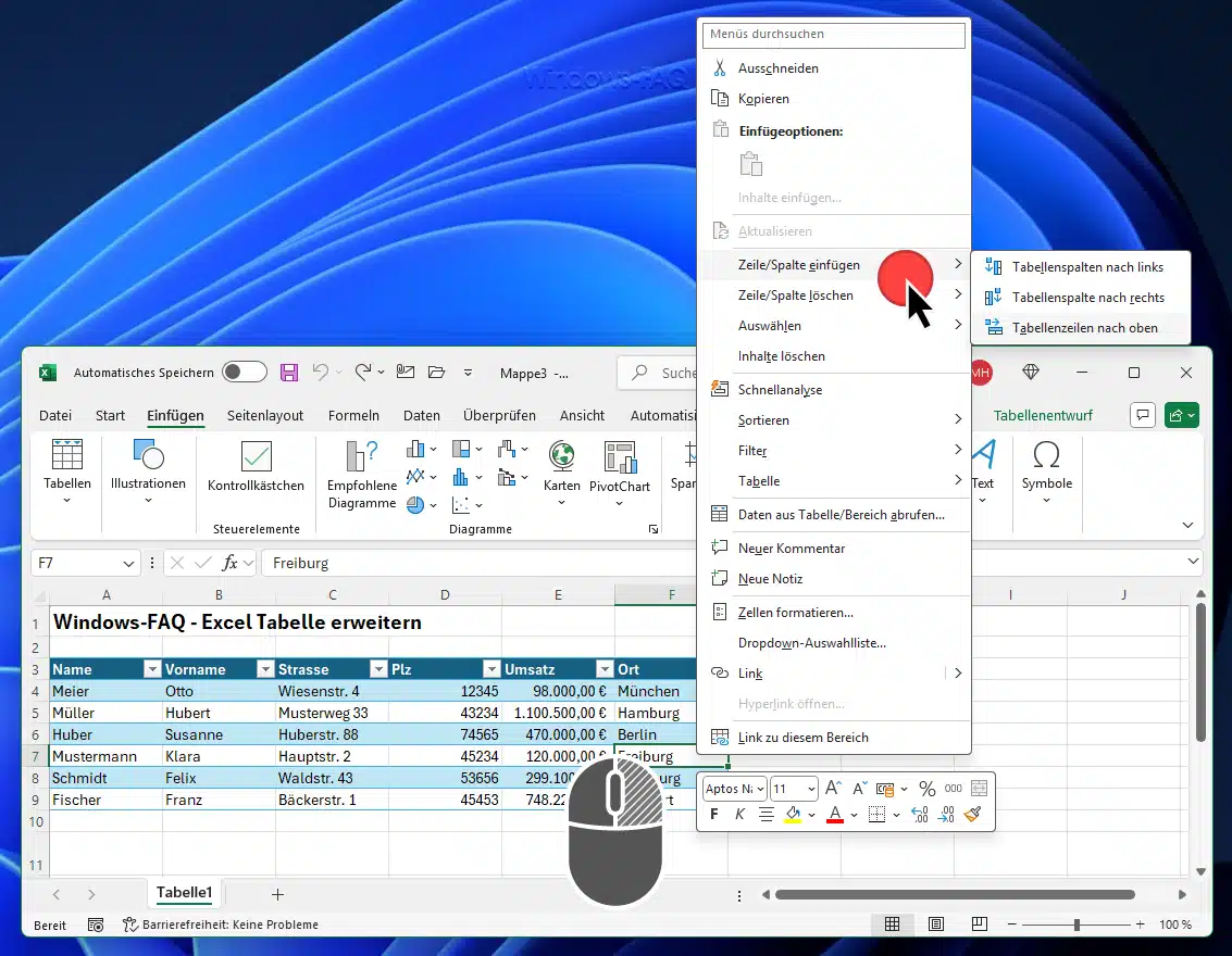 - Direktes Einfügen per Rechtsklick: Klicken Sie auf eine beliebige Zelle in der Zeile, über der Sie eine neue Zeile einfügen möchten. Dann klicken Sie mit der rechten Maustaste und wählen im Kontextmenü Einfügen > Tabellenzeilen nach oben (bzw. „Zeile einfügen“). Excel fügt eine neue Tabellenzeile direkt über der ausgewählten Zeile ein, und alle darunterliegenden Zeilen werden nach unten verschoben. Wenn Sie mehrere Zeilen auf einmal einfügen wollen, markieren Sie entsprechend viele Zellen oder klicken Sie auf die Zeilennummern, bevor Sie Rechtsklick und Zeile einfügen wählen.