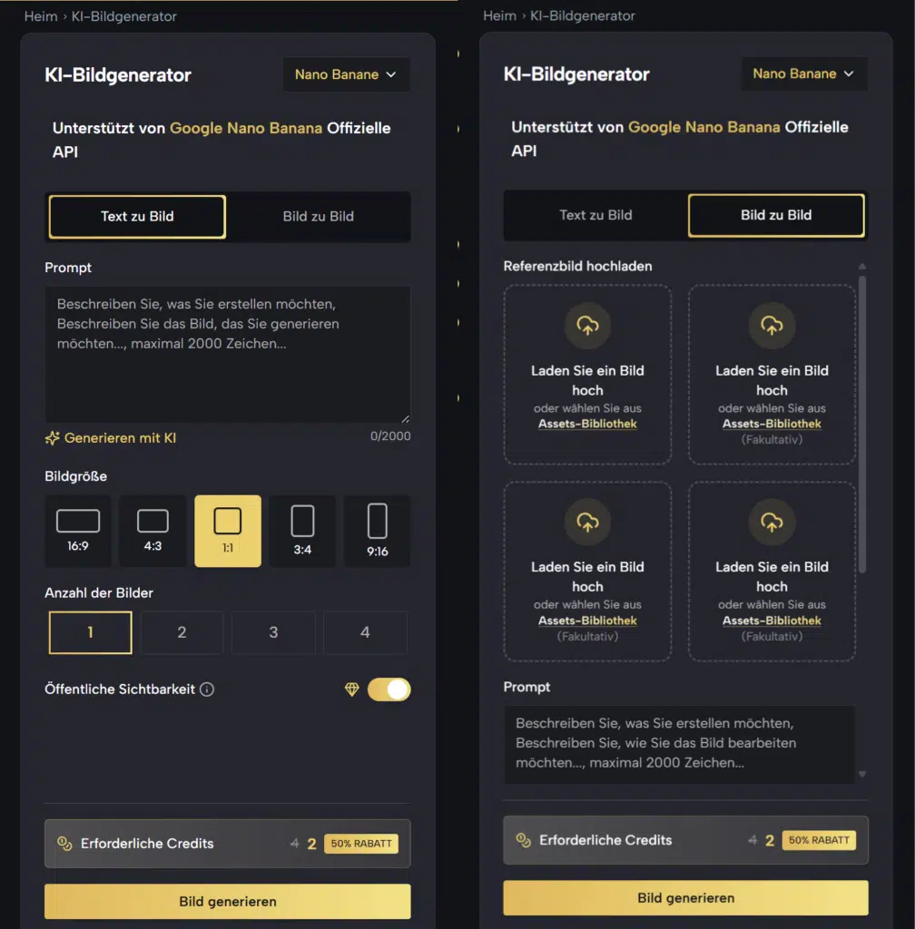Klicke auf Nano Banana AI und wähle den gewünschten Generierungsmodus.