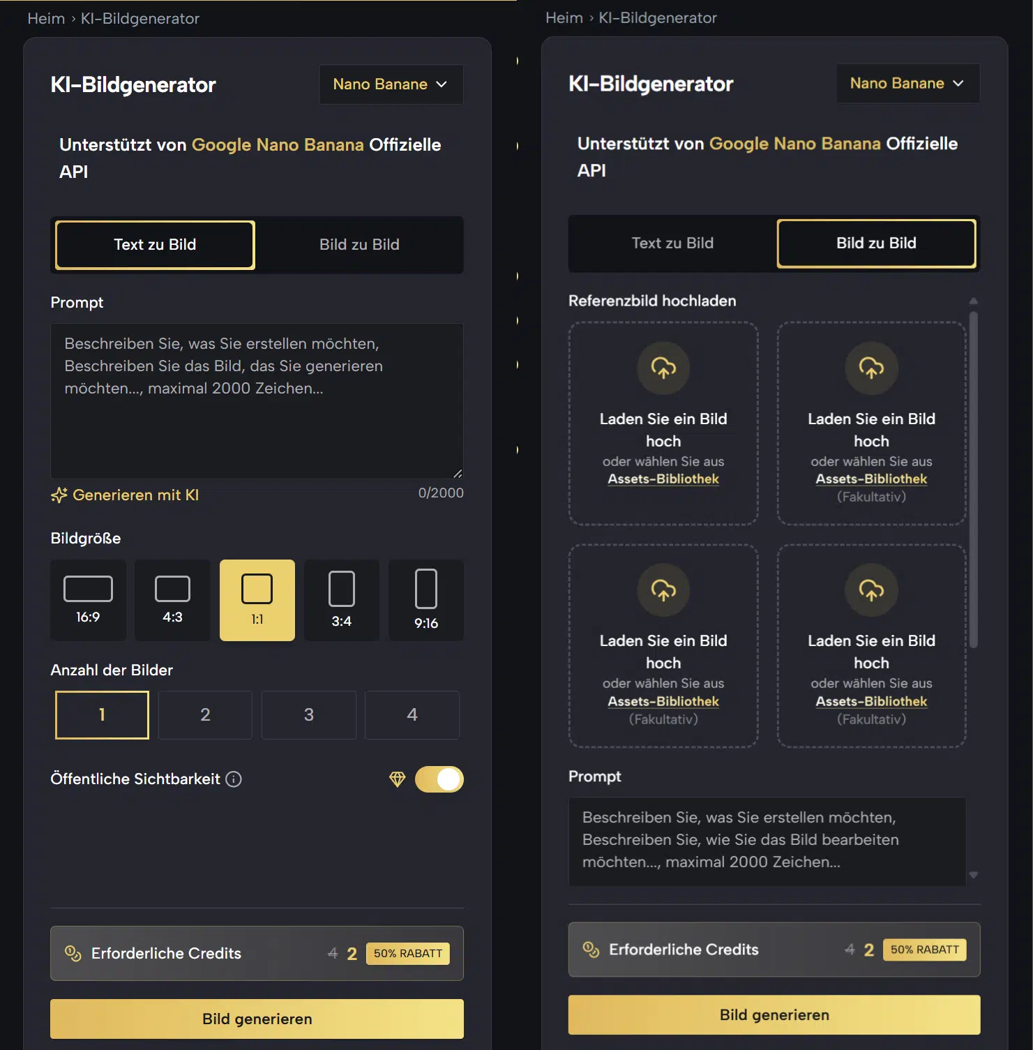 Die Benutzeroberfläche von Nano Banana AI ist klar und intuitiv, sodass auch Anfänger sofort loslegen können. Ob Text-zu-Bild, Bild-zu-Bild, Text-zu-Video oder Bild-zu-Video – alles lässt sich in drei einfachen Schritten erledigen: Modus auswählen → Prompt eingeben → Generieren klicken.