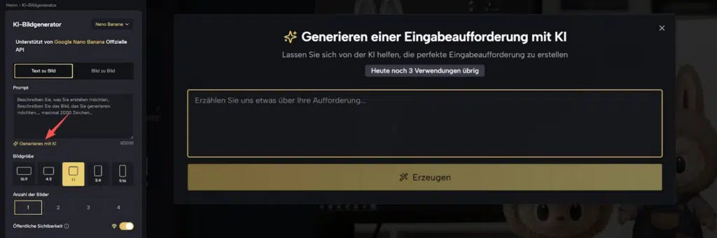 - Bild-zu-Bild → Referenzbild hochladen und Prompt eingeben (z. B. Hintergrund ändern, Stil anpassen)