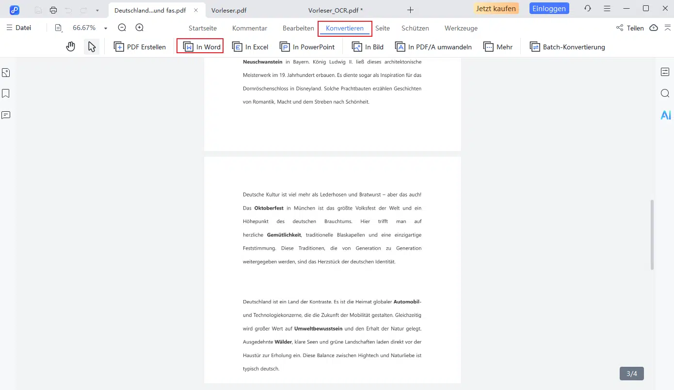 Ist das Word-Dokument in PDNob geladen, wählen Sie als Nächstes die Funktion „In PDF umwandeln“ aus. In der Benutzeroberfläche von PDNob finden Sie meist oben oder seitlich ein Menü oder einen Button für Konvertierung bzw. Erstellen. Klicken Sie darauf und suchen Sie nach der Option, die Ihr aktuell geöffnetes Dokument als PDF exportiert. Bei vielen PDF-Editoren – so auch PDNob – kann dies z. B. ein Symbol oder Menüpunkt mit der Aufschrift „In PDF umwandeln“ sein.
