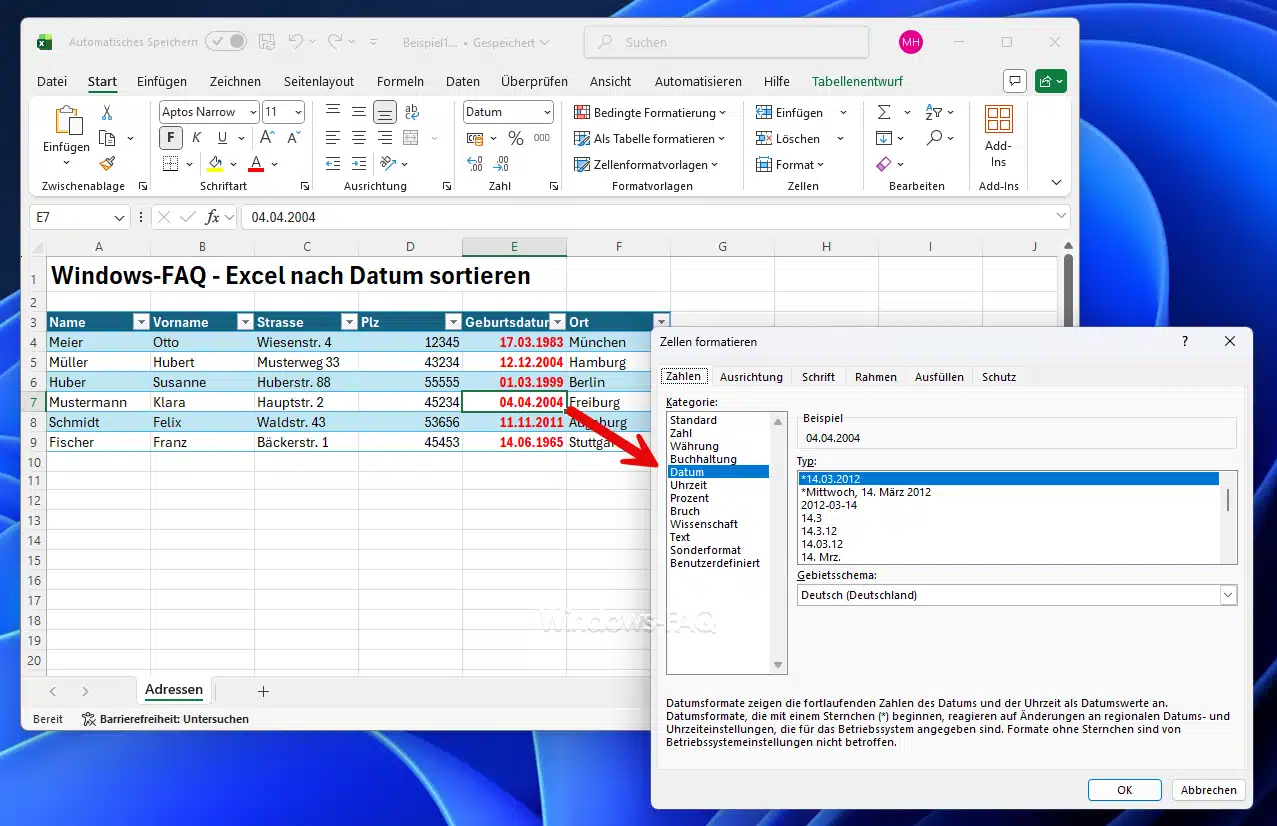 Sobald alle Datumsangaben richtig formatiert sind, können Sie mit wenigen Klicks die Sortierung durchführen. Gehen Sie dabei wie folgt vor: