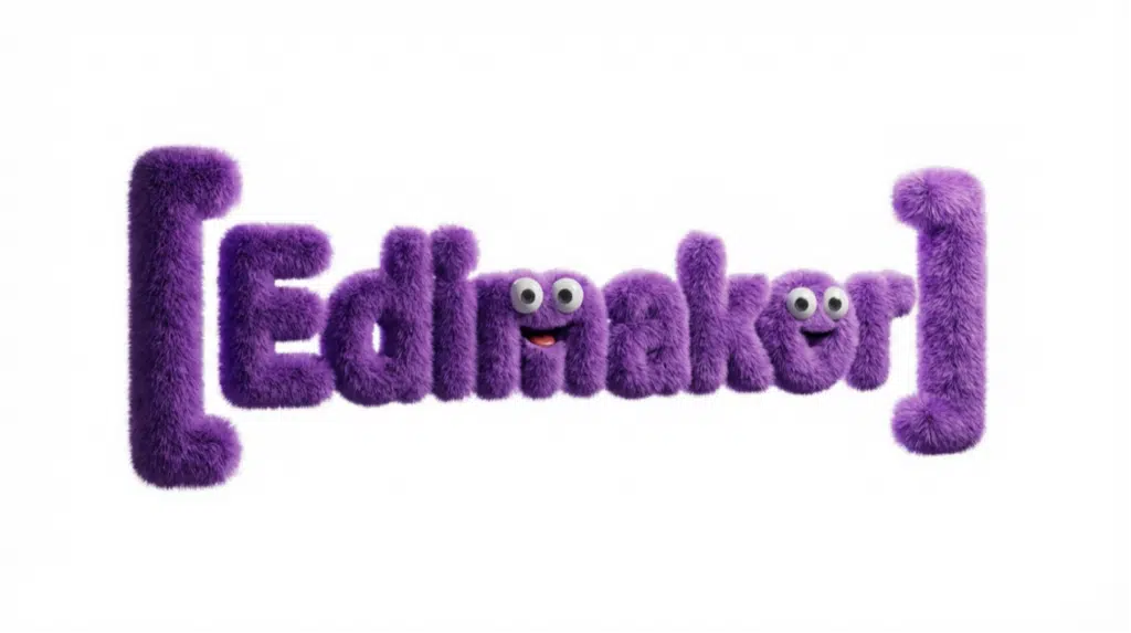 Render the cute letters “[Edimakor]” as a fluffy character, using the letter shapes as the main body structure. Add expressive moving eyes and a cheerful mouth. Cover the entire character with dense purple plush fur resembling high-quality stuffed toys, with photorealistic fiber detail.