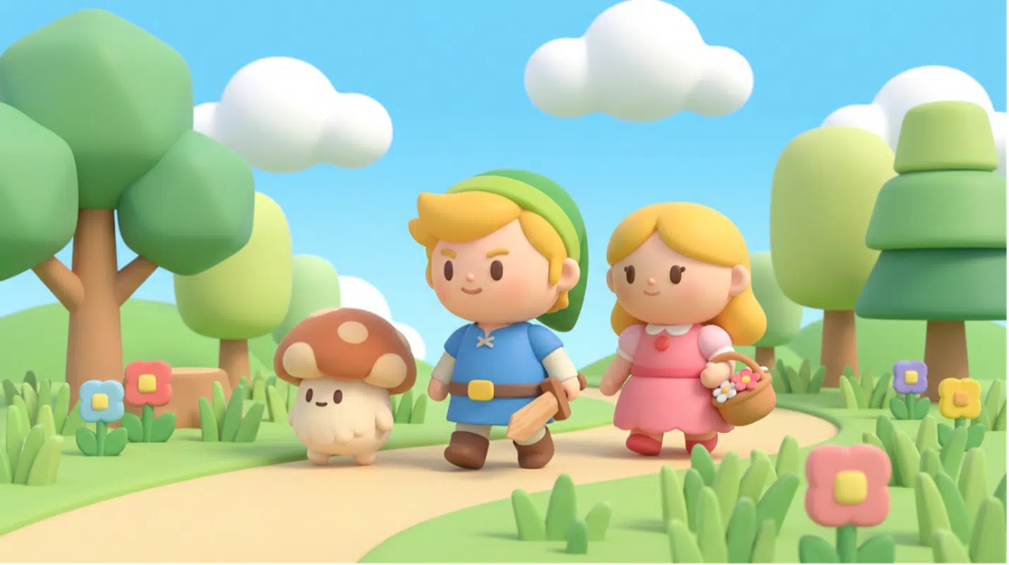 Transform this image into a Nintendo-inspired 3D cartoon style. Use soft, rounded 3D shapes and clean toy-like geometry. Characters should have exaggerated, childlike proportions with expressive, simplified faces and bright clothing—similar to Zelda: Link’s Awakening, Animal Crossing, or Miitopia.