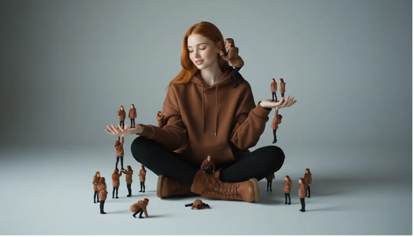 Creative surreal portrait of the man in picture sitting on the floor wearing a brown hoodie, black pants, and boots, surrounded by several miniature versions of herself. Several smaller versions stand on her hands, shoulders, and around her on the floor, interacting playfully with the larger version. The light gray background is minimalist, clean, and simple. The lighting is soft and cinematic, with realistic shadows and depth of field.