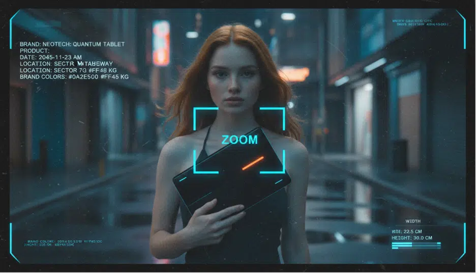 Dieser Prompt eignet sich hervorragend für „Found Footage“-Looks, Sci-Fi-Werbung oder stylische Produktvorstellungen mit Retro-Futurismus.