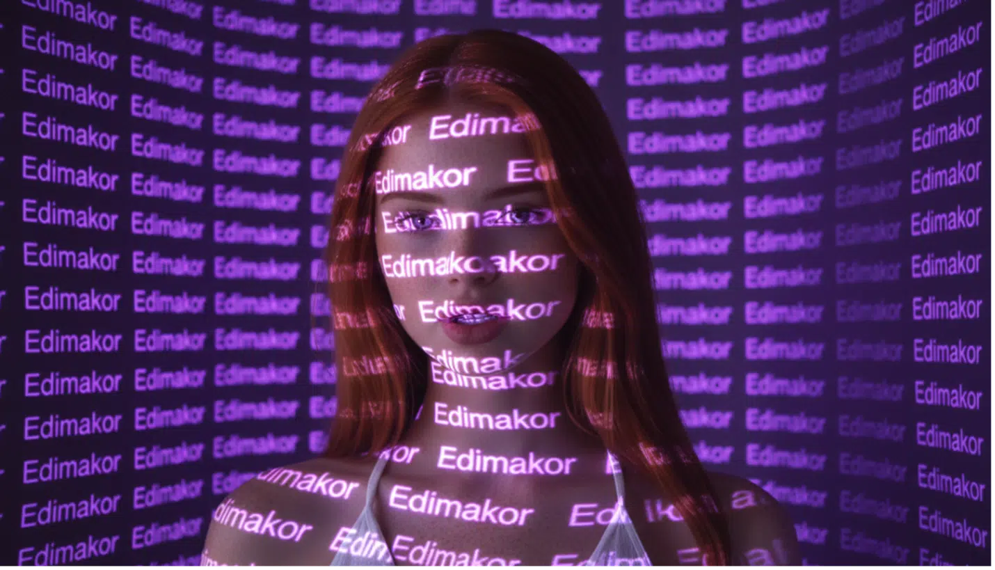 A person in a dark room where the glowing projection of the word “Edimakor” is repeatedly cast onto the walls and the body. The neon purple text wraps around the subject’s shape, creating a surreal futuristic lighting effect.
