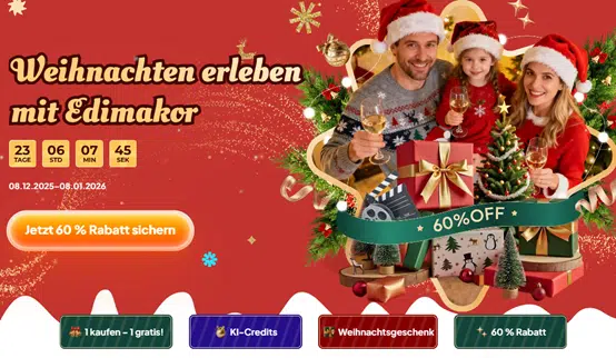 Wenn du Videos mit KI-Effekten, automatischen Untertiteln, Text-to-Speech, Übersetzungen oder kreativen Generierungs-Tools erstellen willst, ist die Edimakor Weihnachtsaktion 2025 eine hervorragende Gelegenheit. Mit bis zu 60 % Rabatt, Bonus-Credits und exklusiven Bundle-Deals bekommst du ein erstklassiges Werkzeug zu stark reduzierten Preisen – ideal, um deine Video-Projekte auf ein neues Level zu bringen.